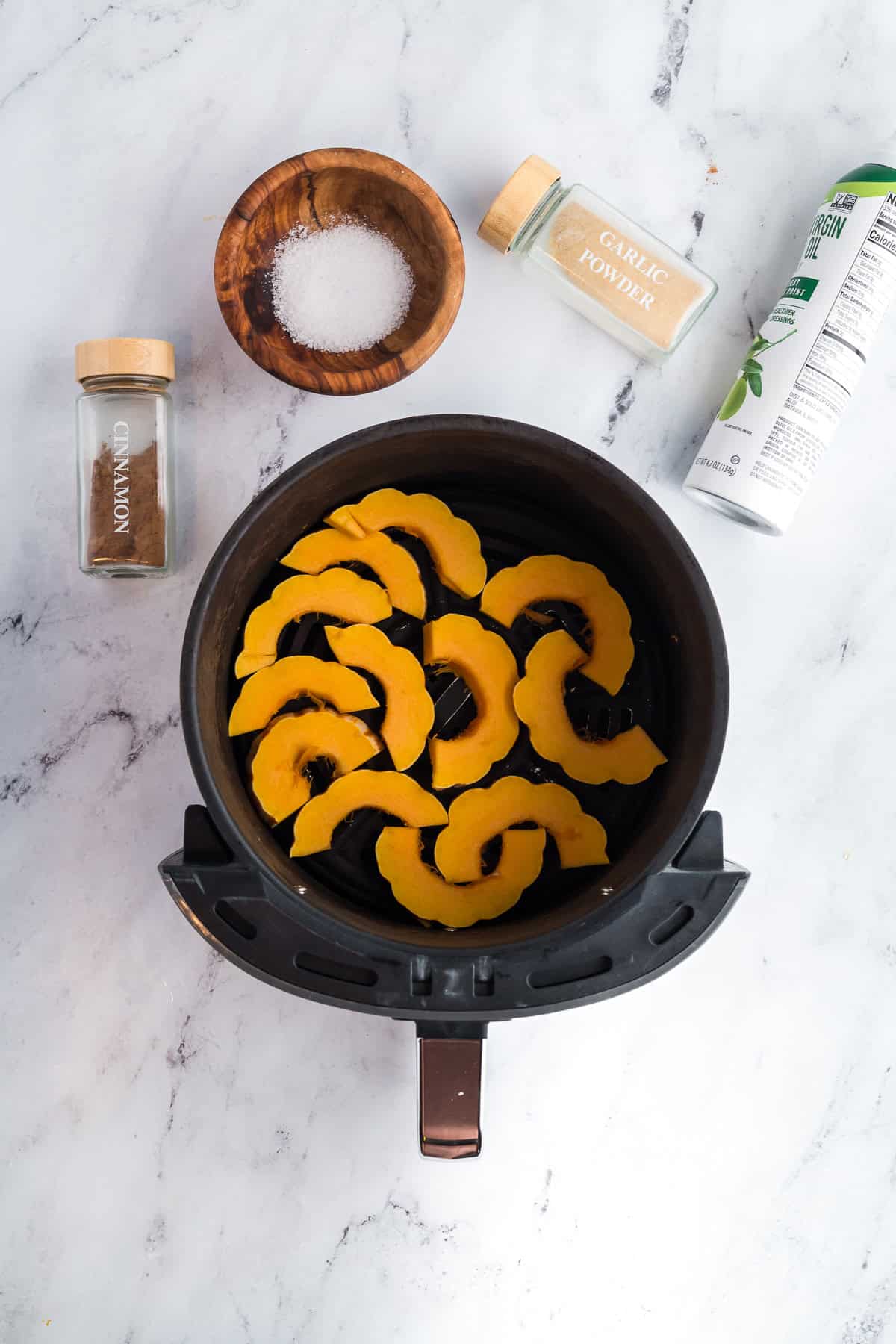 - Arrange squash slices in your Air Fryer or CrispLid basket in a single layer. Spray generously with cooking oil spray then sprinkle on your desired seasonings.