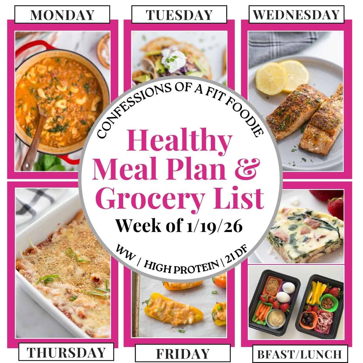 A Healthy Meal Plan full of high protein dinners and a custom lunch to fit your preferences! This meal plan has breakfast, lunch, and 5 dinners to make it a great week in the kitchen! Plus 21 Day Fix Containers, WW points, and a weekly meal planning spreadsheet included, too.