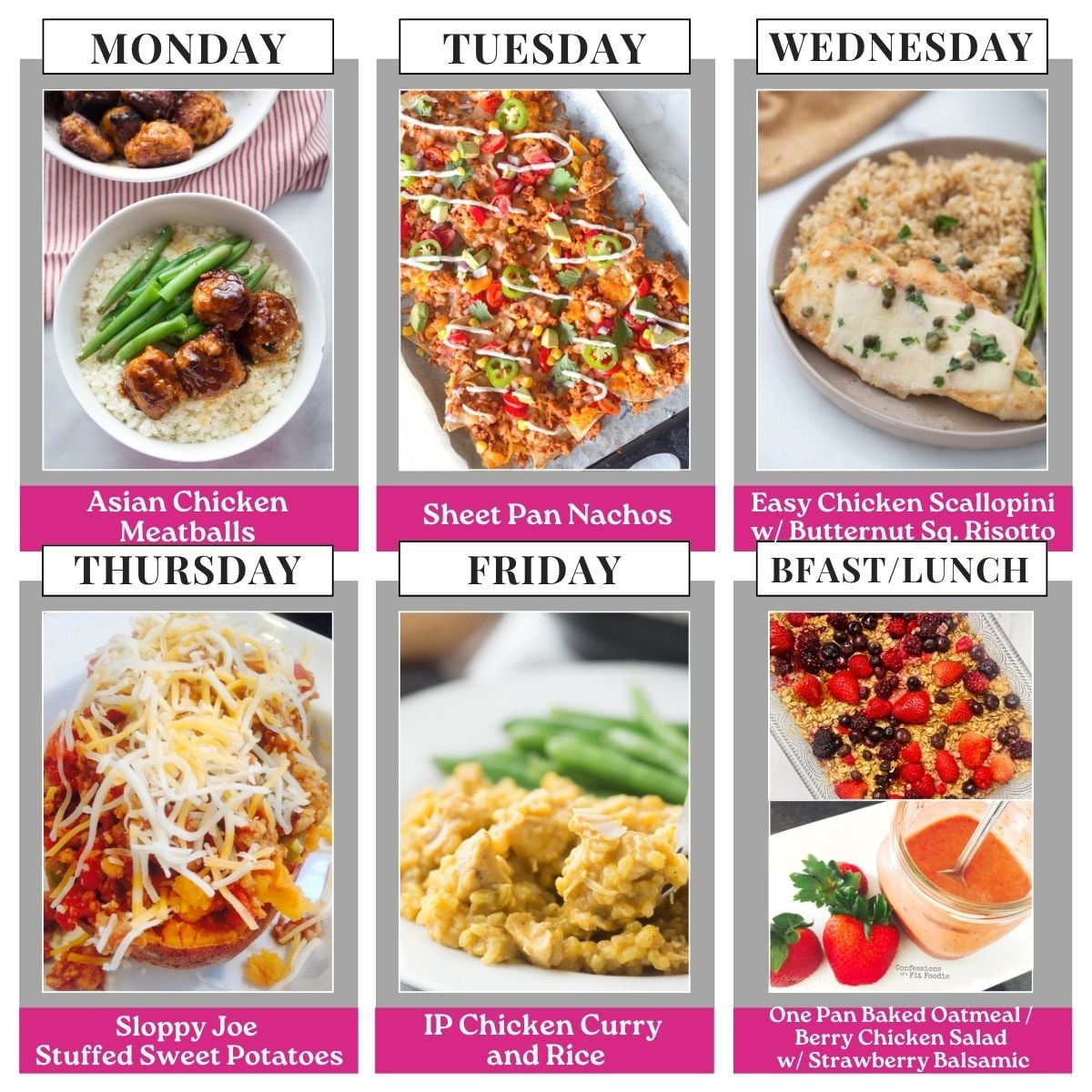 This plan is the best for all the busy nights this time of year. It’s a perfect line up of reader favorites – Sheet Pan Nachos are easily customized for all your family’s preferences, Asian Chicken Meatballs are always a hit, and Sloppy Joe Stuffed Sweet Potatoes are quick and easy for the night you need dinner on the table 20 minutes ago! Pro tip: put the filling over regular potatoes or on buns for your teens or little people!