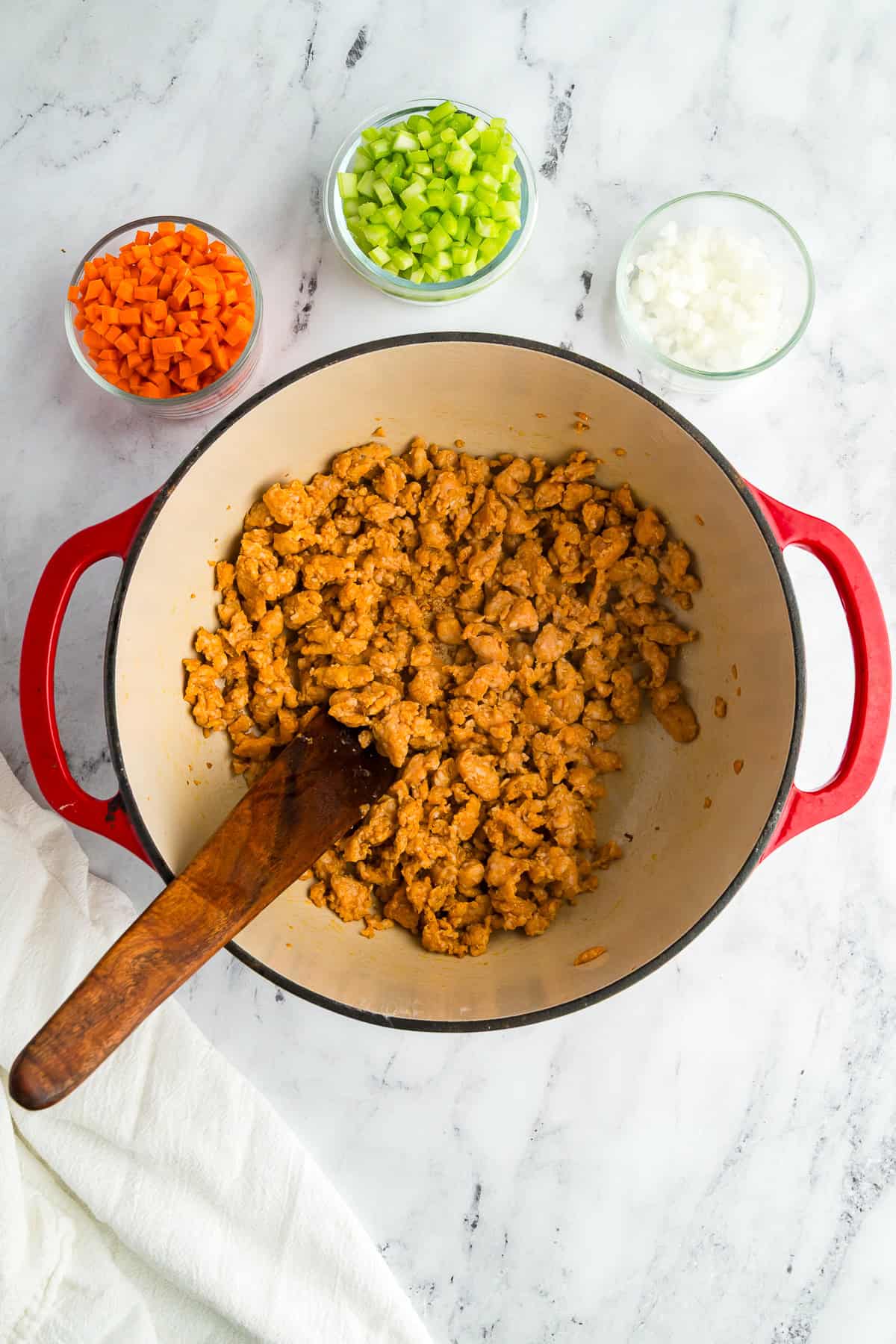 - Next, reduce to medium heat and add in diced onions, celery and carrots. Saute for an additional 5 or so minutes to let the veggies soften and brown slightly, then add in garlic for an additional minute.